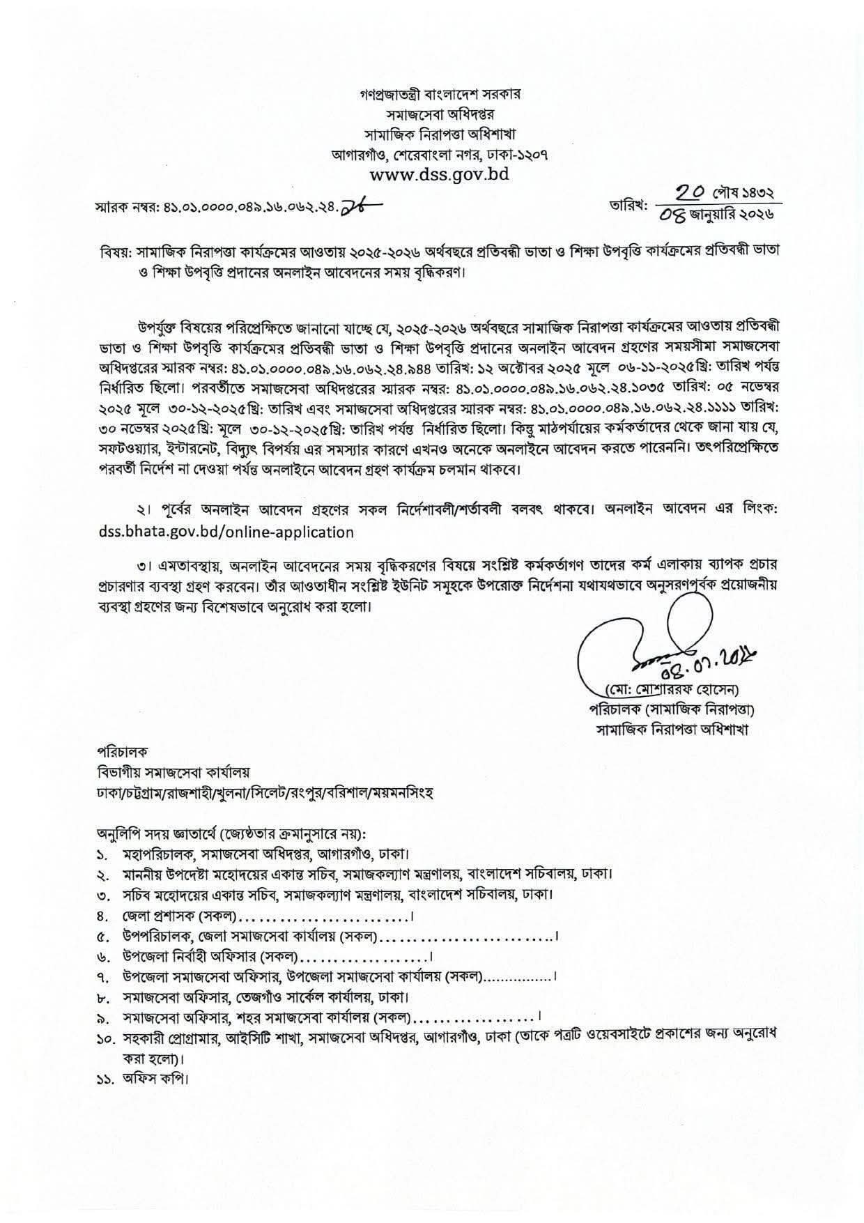 প্রতিবন্ধি ভাতা ও উপবৃত্তির আবেদন সময়সীমা পরবর্তী নির্দশ না দেয়া পর্যন্ত চালু থাকবে ।